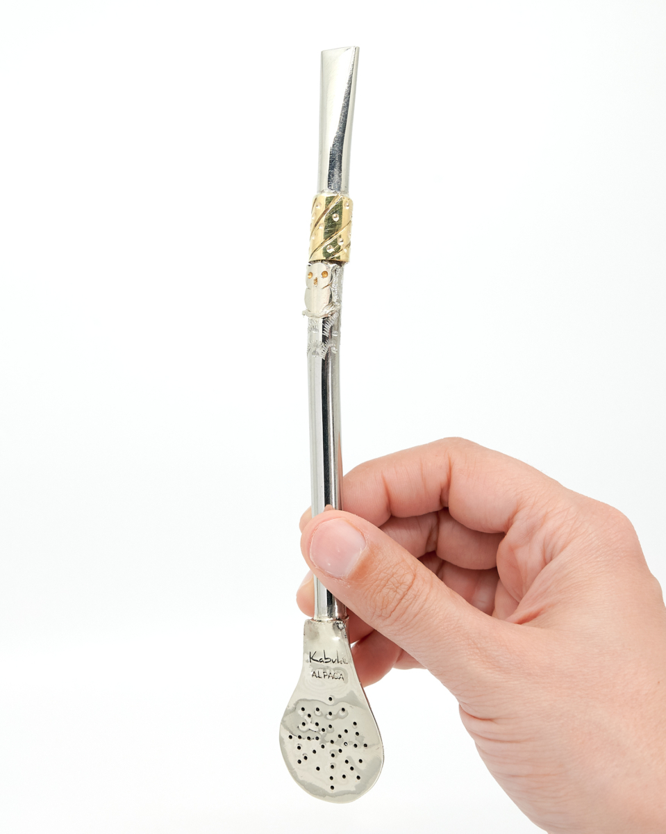 Bombilla modelo único con cinta en bronce y diseño de buho.